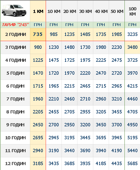 ТАРИФ - "245" (вантажні перевезення автомобілями типу Фольксваген Транспортер, Рено Трафік, Мерседес Віто, Опель Віваро, бусик, "мінібусик"). Транспортуються: стандартний диван-книжка, крісла, стільці, тумби, шафа/сейф/холодильник лежачи, невеликий мотоцикл, мопед, велосипеди, стенди, намети, прилавки, меблева порізка, домашнє начиння, картини, музичне обладнання, інструменти, спортивний тренажер, поліграфія, студентський переїзд, виїзд на природу/дачу, сорок-п'ятдесят середніх коробок, дві палети, п'ять кубічних метрів, вісімсот кіло. Заїжджає в підземні, надземні, багатоповерхові паркінги. Комфортний, швидкісний, дуже маневровий.