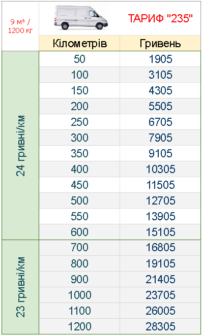 Тариф "235". Ціна за км 24.00 (12 по колу).