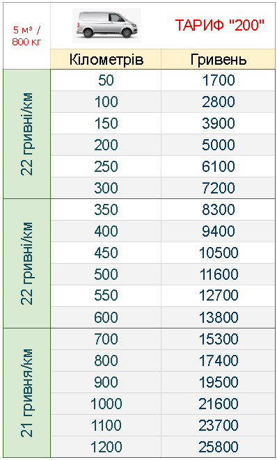 Тариф "200". Ціна за км 22.00 (11 по колу).