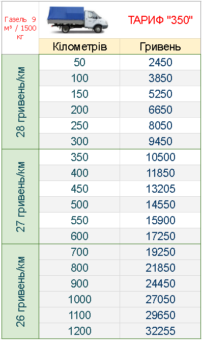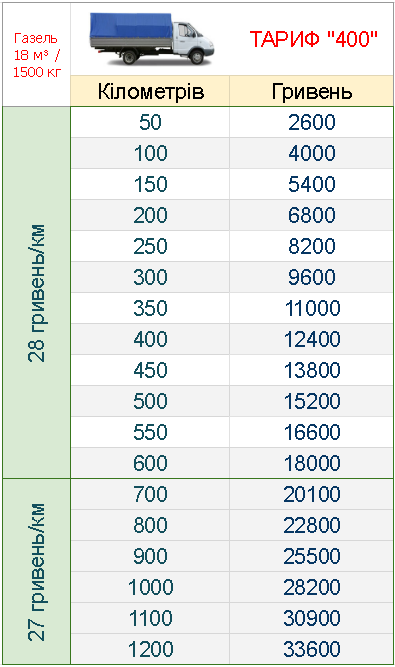 "Газелі" тариф "350/400" - 28 гривень/км (14 по колу)