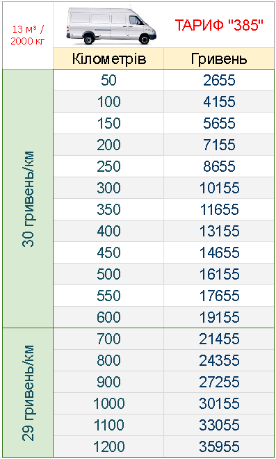 Тариф "385". Ціна за км 30.00 (15 по колу).