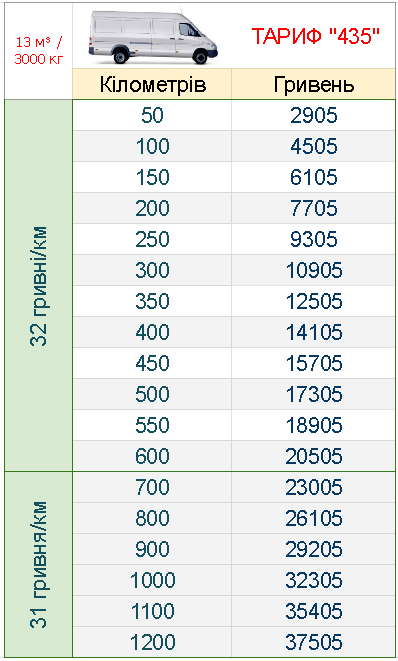 Тариф "435". Ціна за км 32 гривні (по 16 туди/назад).