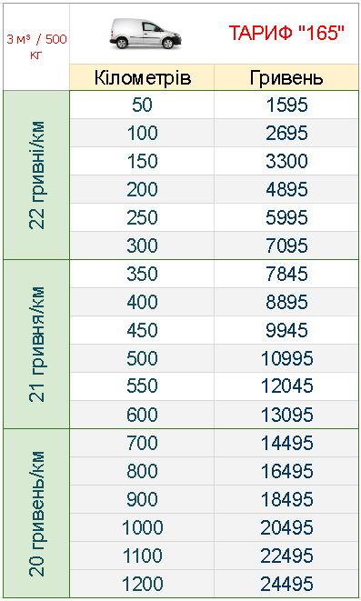 Тариф "165". Ціна за км 22 гривні (11 по колу).