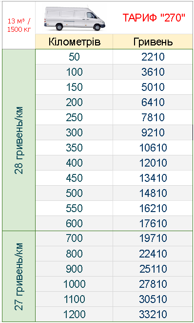 Тариф "270" Ціна за км 28 гривень (14 в обидві сторони).