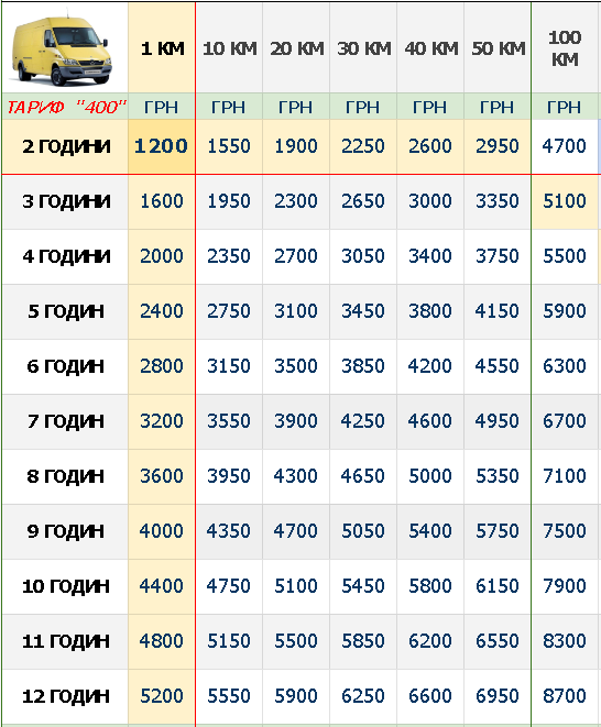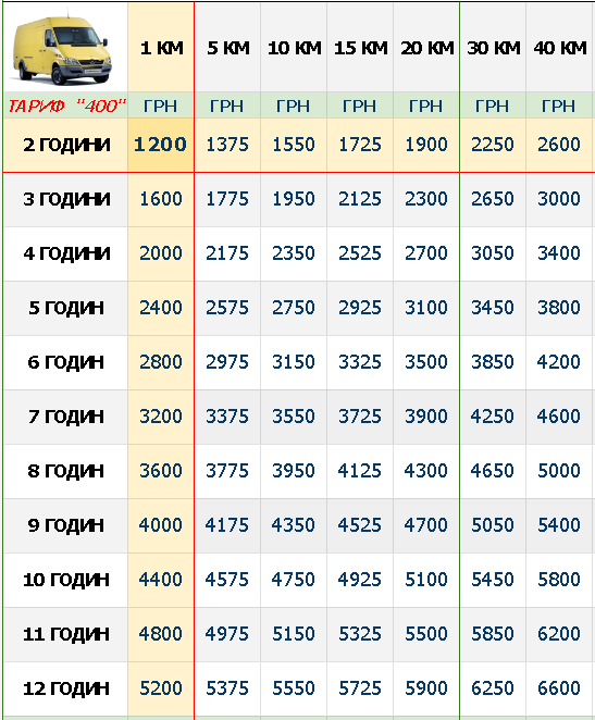 Для самостійного попереднього підрахунку вартості майбутньої поїздки бусом типу Мерседес Спрінтер (максі база 4.2 м двотонник), знаючи приблизний час залучення авто та довжину маршруту, використовуйте цю таблицю (натисніть, щоб збільшити).