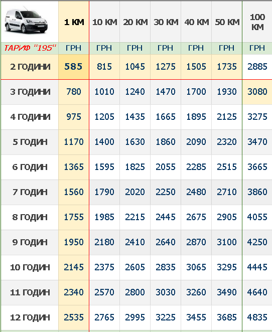 ТАРИФ - "195" (вантажоперевезення легковими фургонами, автомобілями типу Рено Кенго, Фольксваген Кадді, Фіат Добло, "пиріжок", "чобіток"). Транспортуються: малогабаритна побутова техніка (одна пральна, посудомийна машина, газова плита...), дрібне промислове обладнання (апарат приготування кави, зварювальний апарат, електрогенератор...), канцелярія, музичні інструменти, дрібне домашнє начиння (пару тумбочок, поличок, стільців, табурет...) невеликих розмірів картини, мало поліграфії... кілька сумок, валіз (завезення: аеропорт, залізничний, автобусний вокзали), три кубічні метри, вантажопідйомність не перевищує п'ятсот кілограм. Проїжджає під балками підземних, надземних, багатоповерхових парковок, воріт більшості звичайних гаражів. Дуже комфортний, швидкий, дуже маневрений (як легковик).